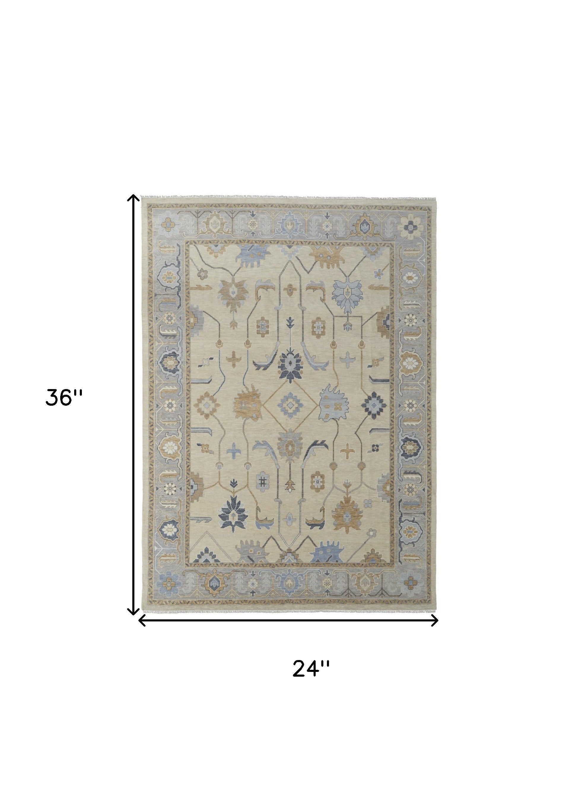 4' X 6' Gray Ivory and Blue Wool Floral Hand Knotted Area Rug With