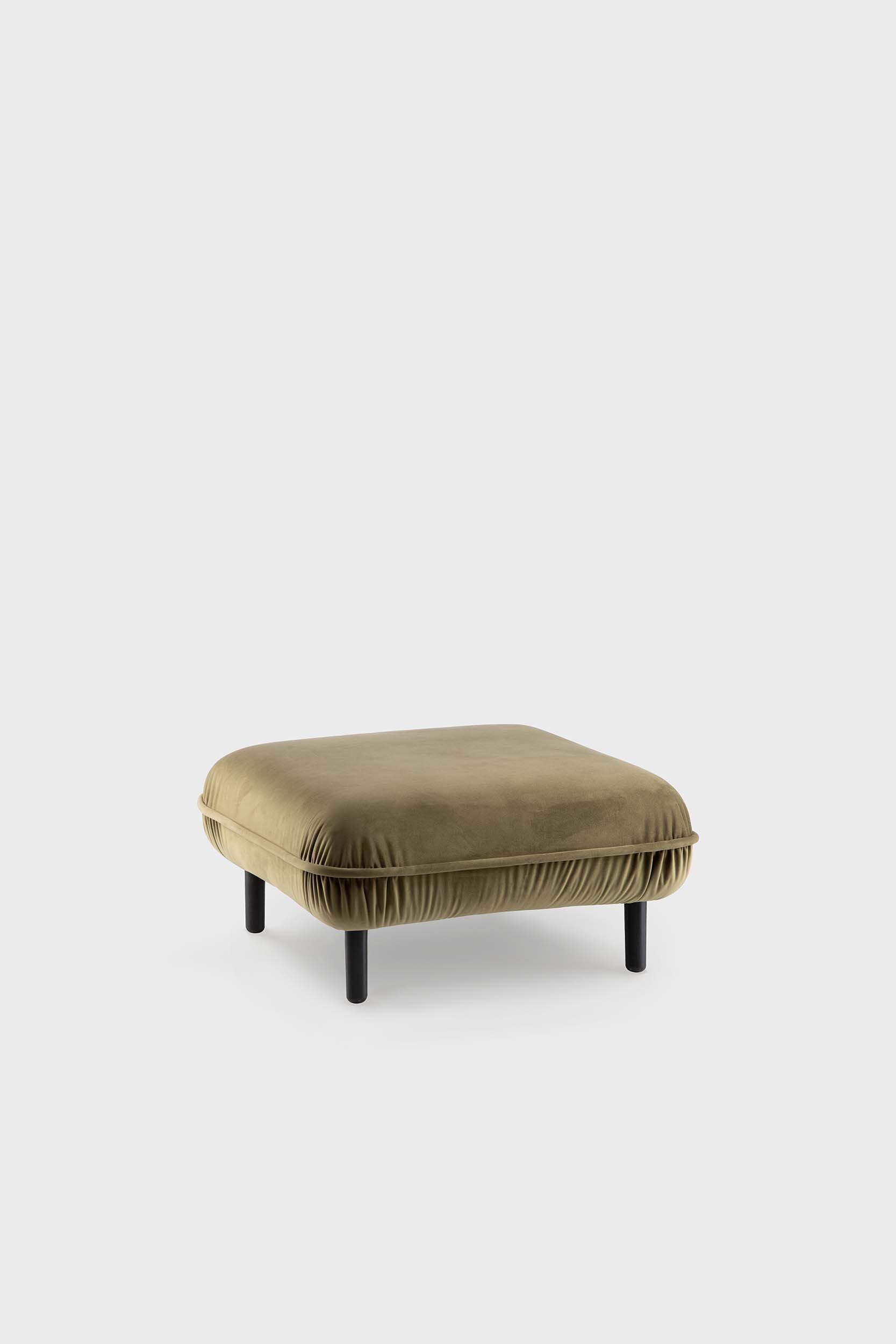 Bean modular sofa combines simple design with functionality. Due to its rounded corners, it is easy to join the segments and form a lounge of two, three, or more seats. Meanwhile, a pouf works well on its own or as an extension for your sofa. Elegant wooden legs also add some lightness to a bit chubby base and ease the floor cleaning. Finally, pleated velour fabric brings a bohemian feel and is extremely soft to touch.